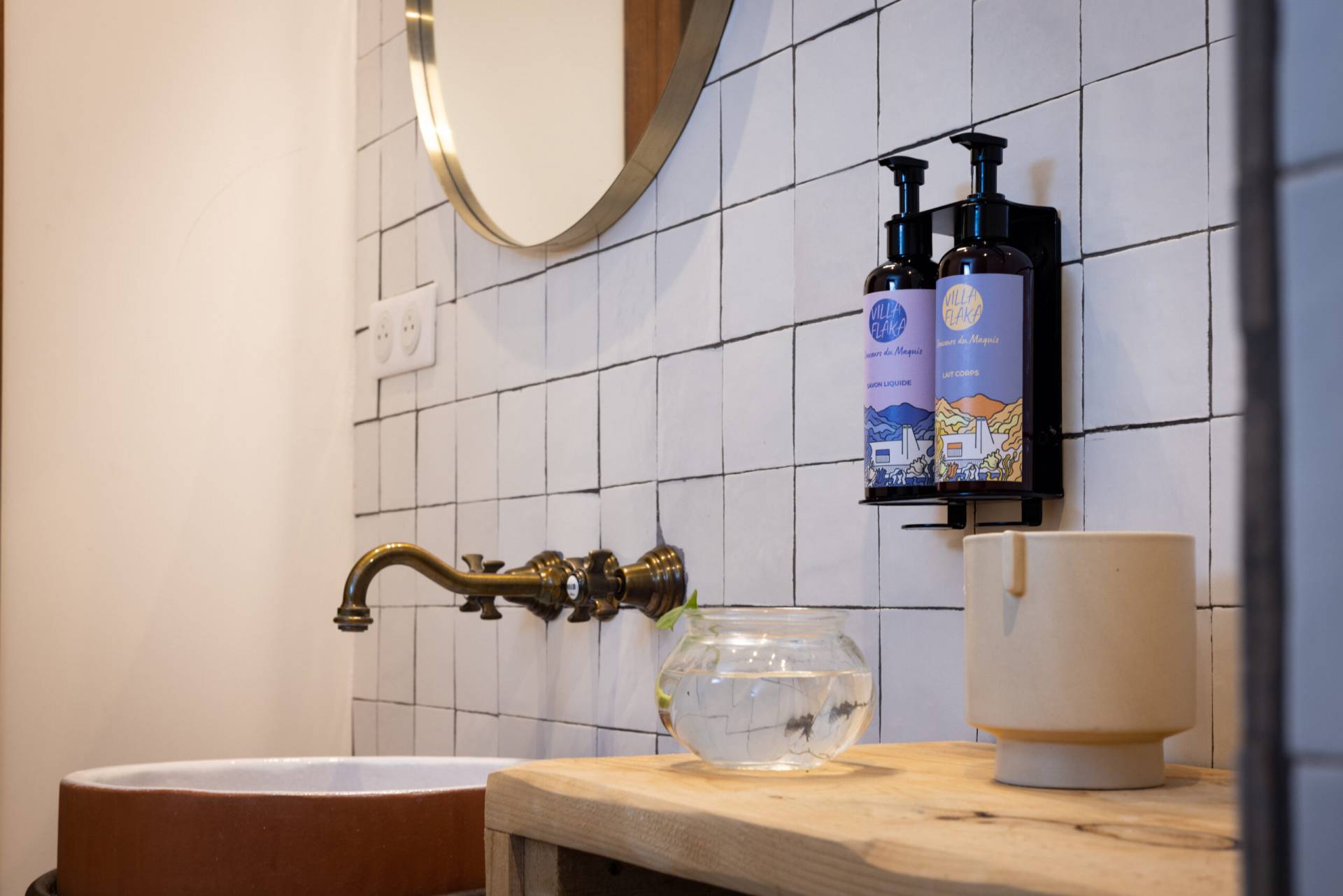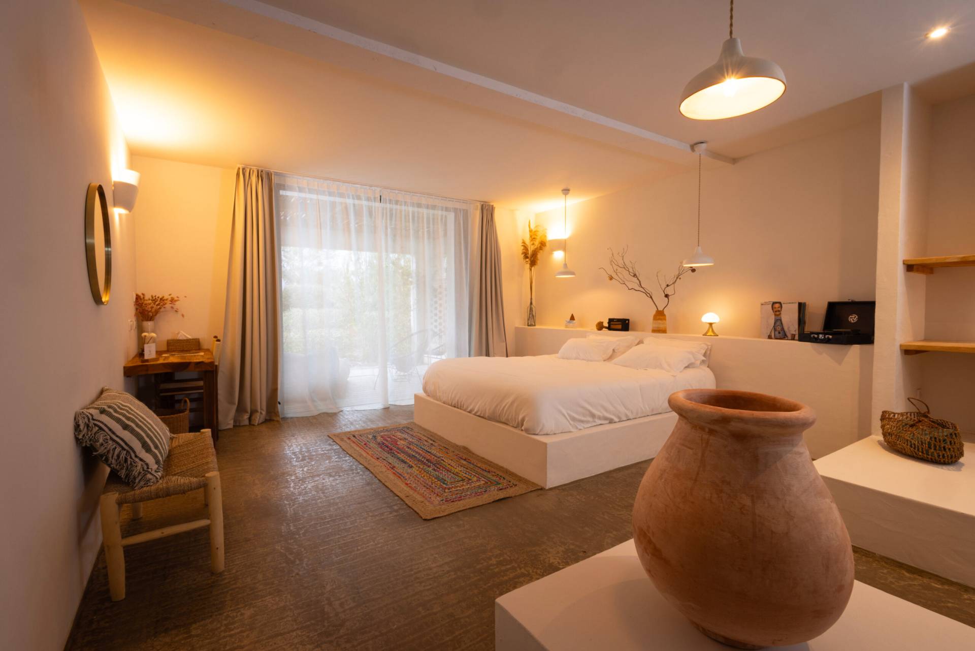 Située en rez-de-jardin, avec sa décoration minimaliste à l’esprit WABISABI, son lit King size, sa douche XL, et sa terrasse qui flirte avec notre jardin peuplé d’oliviers centenaires et de plantes aromatiques endémiques